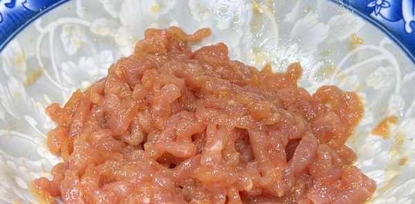 接下来准备一小块里脊肉,先换刀切成薄片,再换刀切成细丝,全部切好放在碗里。加少许盐,胡椒粉,一勺酱油,再加入一半蛋清。然后用筷子拌匀。搅拌均匀后加入一小勺生粉,锁住肉片中的水分。用筷子不断搅拌,让肉片沾上一层薄薄的淀粉。混合均匀后,放在一边备用。