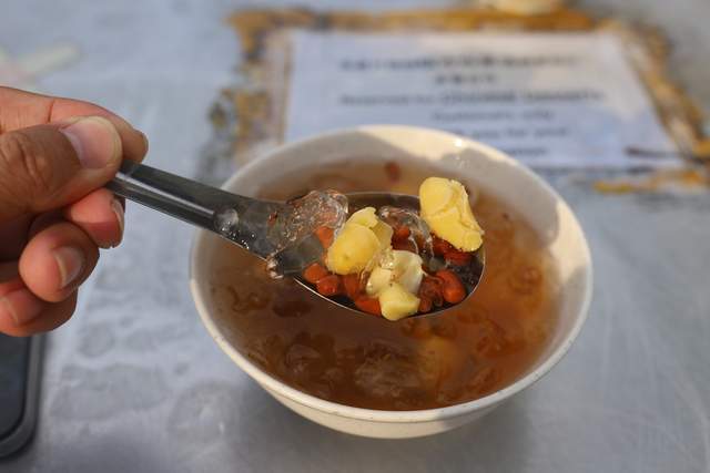 这条美食街不长,手推车分别放置美食街的两侧,旁边有窄巷,摆了些胶椅和桌子,供食客休息吃饭使用。