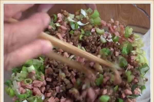锅里倒油,把肉末倒进去煸炒到变色。放点酱油,适量的盐,料酒,翻炒均匀之后关火,把肉馅儿取出,再把火腿丁倒进去。倒上葱末姜末,少放一点花椒粉搅拌均匀。