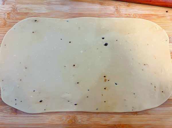 3,把揉好的面团擀成长方形的薄片,上面有一些没有融化的红糖也没关系,这样更好吃。