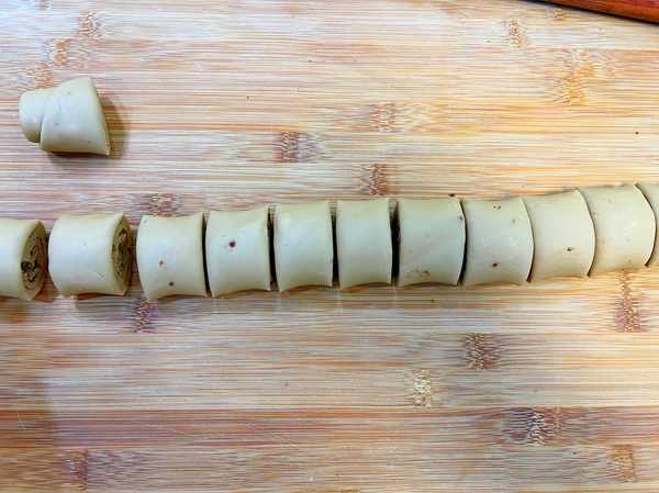 5,自上而下把面团卷起来,再稍微轻轻滚动几下,把面团揉紧实,用刀切成小剂子。