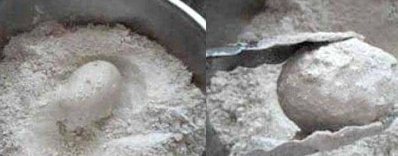 3.将选好的鲜鸭蛋,在糊浆中浸蘸一下,使其粘满料浆,再滚上一层干粉,装缸密封。