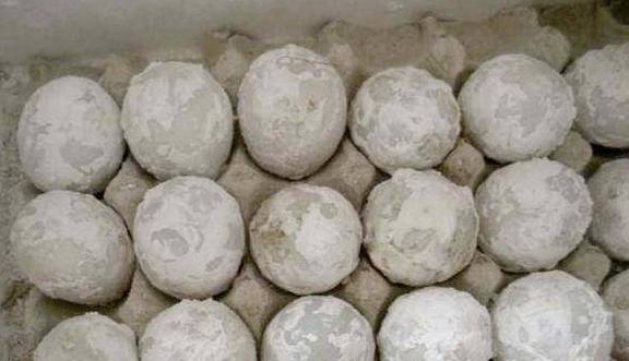 5.按时打开容器或塑料袋,将松花蛋裸露在空气中透气退火(去除碱味),有条件的可以将松花蛋摊放着地上。