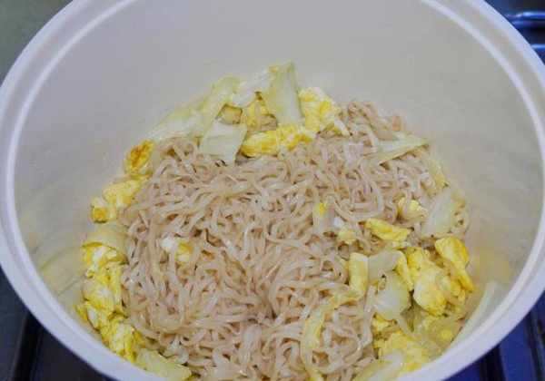 接着加入高丽菜,中小火炒至熟软后才倒入烫煮过的泡面拌炒,