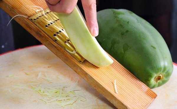 食材+调料:青木瓜300g、红萝卜20g、辣椒5g、蒜头10g、花生碎10g、泰式鱼露10g、糖20g、柠檬汁30g、烧鸡酱30g