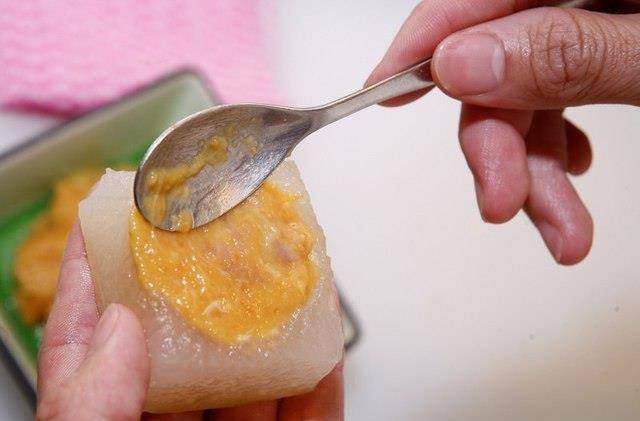 冬瓜放入热水中煮至软(竹签或筷子能插入的程度),中间用汤匙挖洞。