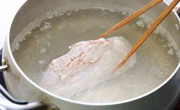 起一锅热水,放入整块鸡胸肉汆烫至熟,约煮6分钟。