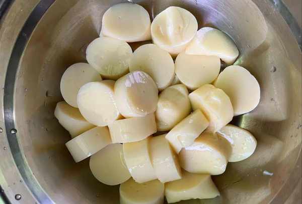 将备好的日本豆腐放在案板上,用刀直接从中间切开,然后倒放在盆里面。很快豆腐就掉出来了,用刀给它切小段,切好放一旁。切这个豆腐的时候最好用从中间一刀直接切开,讲究快,准,狠,这样可以将豆腐切得切出来比较完整好看;