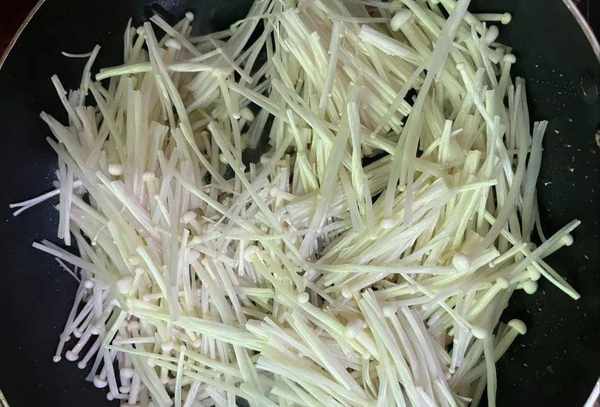 4.随后我们把蒜瓣炒香,金针菇放入油锅中,用铲子给它炒一下,金针菇的水分含量高,用中小火炒。金针菇炒好后,我们在将日本豆腐倒入里面,下锅后用铲子多翻炒,炒均匀。