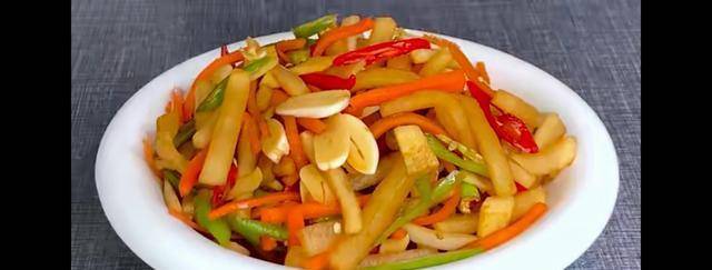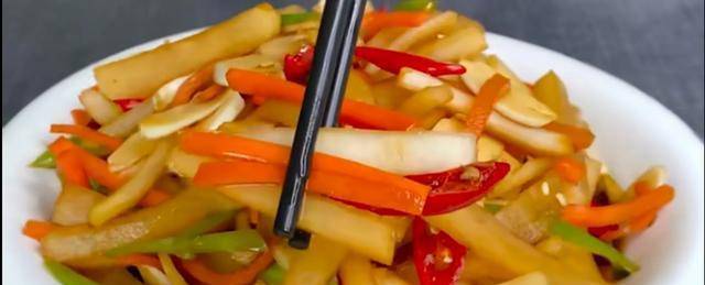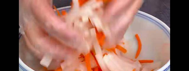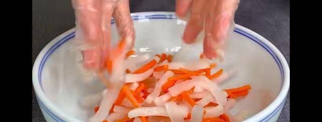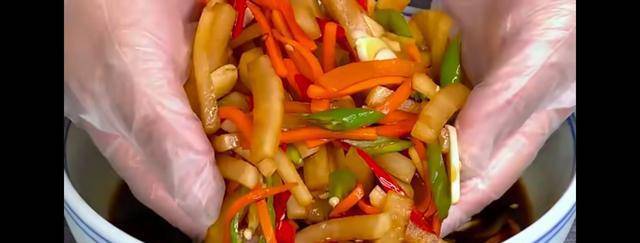 4、用手或纱布使劲将萝卜条儿挤干水分,倒入蒜片儿,姜片儿,青红椒丝和晾凉的料汁,抓匀,让萝卜条儿完全浸泡在汤汁里面,封上保鲜膜冰箱冷藏两个小时就可以开吃了。还可以多做一些装进无水无油的密封容器里放一年也不会坏