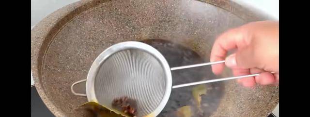 2、准备一个碗儿,加入100g生抽,80g香醋,一勺食盐、一勺白糖倒入小半碗的清水搅匀化开,倒入锅中,加入少许花椒,八角,香叶开大火烧开,中小火煮两分钟,捞出香料,倒入碗中,晾凉备用