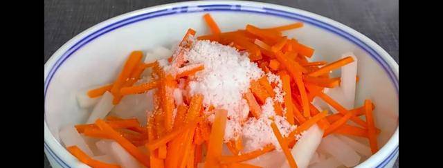 1、两根洗净的白萝卜切去头尾,改刀切成5cm左右的长段儿,再切成1cm左右的厚片改刀切成长条,装入大碗中,准备一根胡萝卜也是同样操作,切好后也装入大碗中,加一勺食盐,一勺白糖,用手抓匀,腌制一个小时,杀出水分