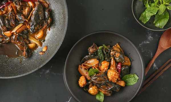1只 乌鸡,半只 鲍鱼 8-10只,九层塔 1把,大蒜 8瓣,姜 8片,黑麻油(芝麻油、香油),30毫升 台湾米酒(或料酒),30毫升,生抽 4勺(约15毫升),老抽 2勺(约8毫升),冰糖 约5-8克,盐适量,干辣椒(可无)3-5个,料酒适量