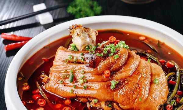 5.如加隔年老卤汁应滤去油膜和肉屑以保持汤味醇厚;出锅前用旺火烧煮,并放味精使卤汁稠浓,紧包猪蹄而入味;食用时,切片上桌。