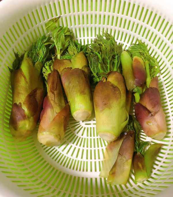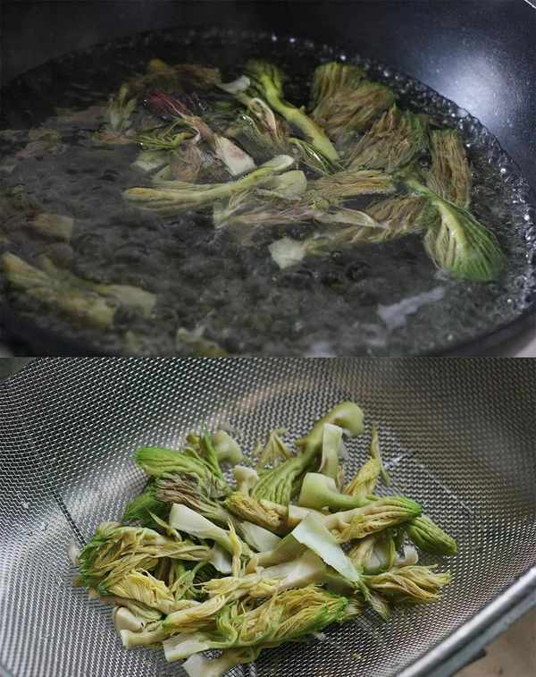 1、将买回来的树头菜去皮洗净,下锅焯3-5分钟左右,捞出过冷水沥干水份备用!