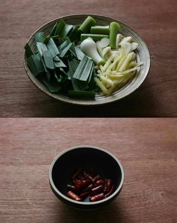 2、将腊肉洗净煮熟后切片,蒜苗切段,准备少许姜蒜、干辣椒备用。