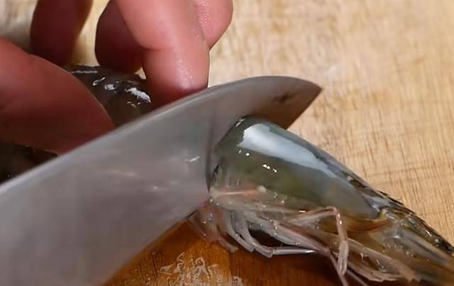 在剥虾时,记得先将虾头、虾壳留起来;取虾头时,建议用菜刀切下,剩下虾壳再用手剥: