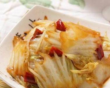 准备材料:白菜350克,红尖椒10克,青尖椒10克,以及辣椒(红,尖,干)5克,大葱5克,姜3克,盐3克,味精2克,豌豆淀粉5克,白醋5克,香油5克等调料。将干辣椒切块,葱切段,姜切成细丝;青、红辣椒去蒂、籽,切菱形片;将白菜去叶,留颈部,改成0.3厘米厚的抹刀片;锅内加少许底油烧热;依次放入葱花、姜丝、干辣椒、青红辣椒片;爆香后加入白醋,然后迅速将切好的白菜放入锅内;加入精盐和味精翻炒,勾芡,加少许香油,出锅即成。