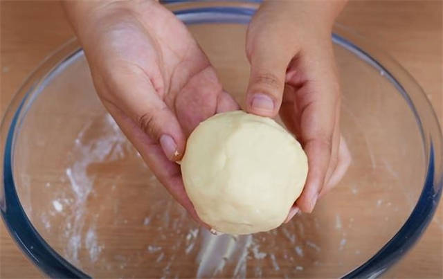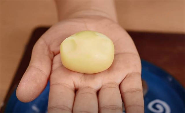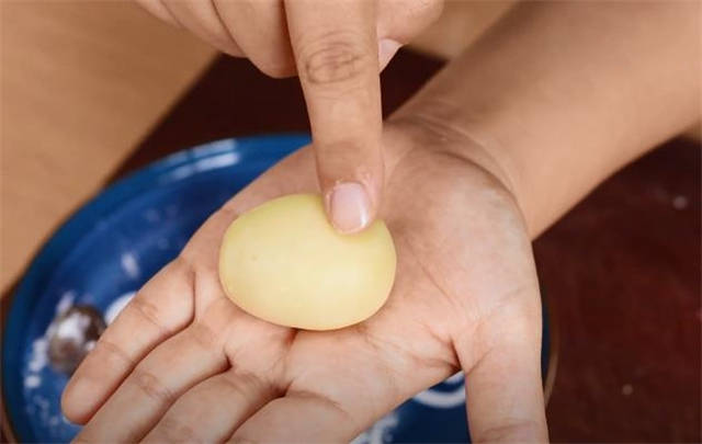 3.处理小剂子的时候,先在掌心不断的揉匀,再稍微的搓一下按扁,中间放上一颗豆沙馅,大概是10g。