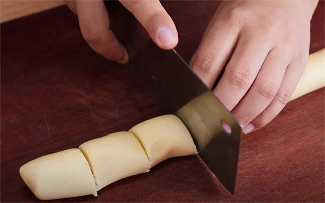 2.现在面团已经饧好了,直接搓成长条,分成八个小面剂。