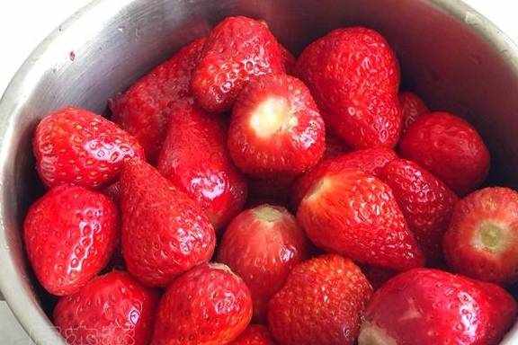2、清洗干净的草莓去蒂,稍微沥干表面水份