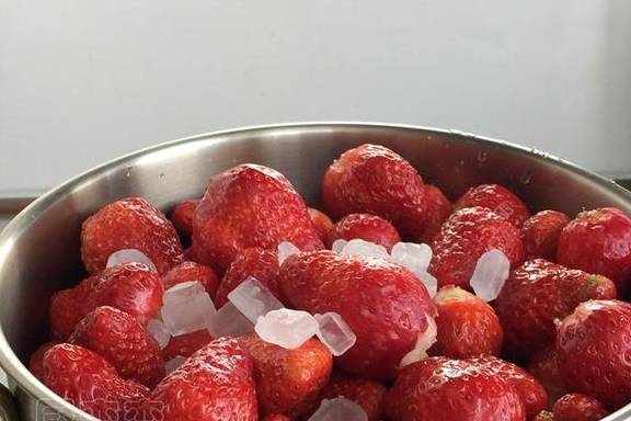 1、草莓放清水里,加盐和少许面粉,泡洗干净