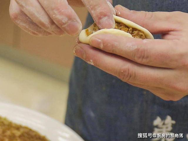 揪下一个面团,放在盘子里用手摁成薄圆的饼,放上调好的馅料把面皮提起,像包包子那样收紧开口,把多余的面摁实防止露馅,这样肉盒的生坯就做好了。