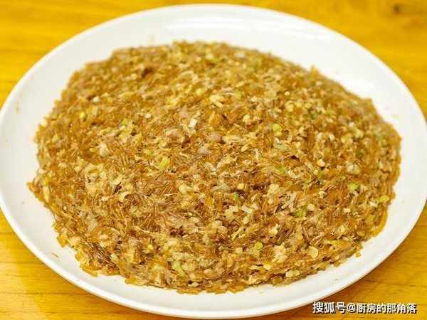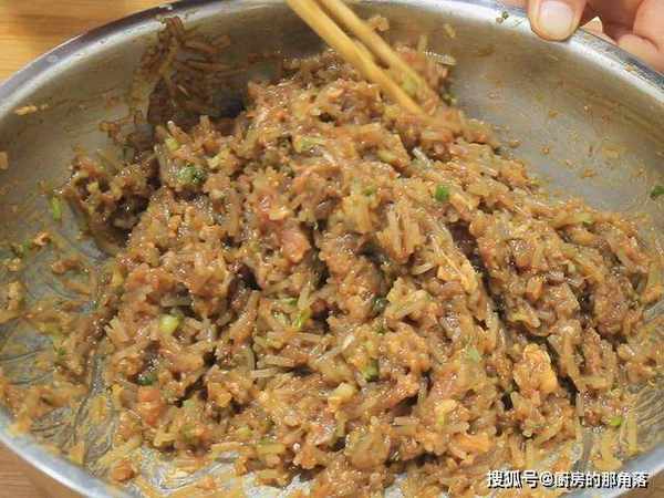 粉条一把倒入刚烧开的热水浸泡10分钟,泡软后捞出控水,然后把它切碎,加入老抽2克拌匀,取一部分肉馅和粉条搅拌均匀,馅料就制作完成。