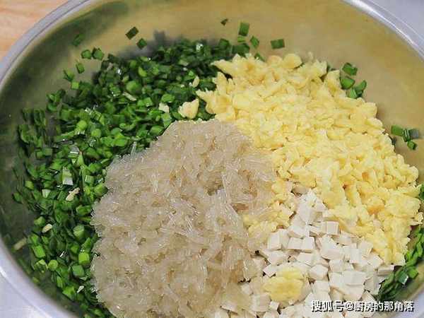 清洗干净的韭菜切成韭菜碎、老豆腐一块切成碎粒、一把粉条用热水泡软切碎、4个鸡蛋炒成鸡蛋碎,把它们都放到一个盆中,倒入适量的香油搅拌均匀,这时先不要放调料以免韭菜出水。