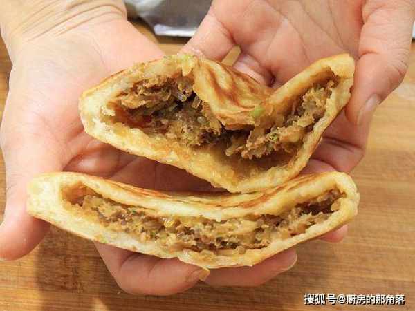 起锅烧油,油温5成热时放入生坯,等到周围变色后就要翻面,需要多次翻面,大约烙3分钟左右,直到肉盒子烙至两面金黄酥脆,摁压不变形即可出锅。