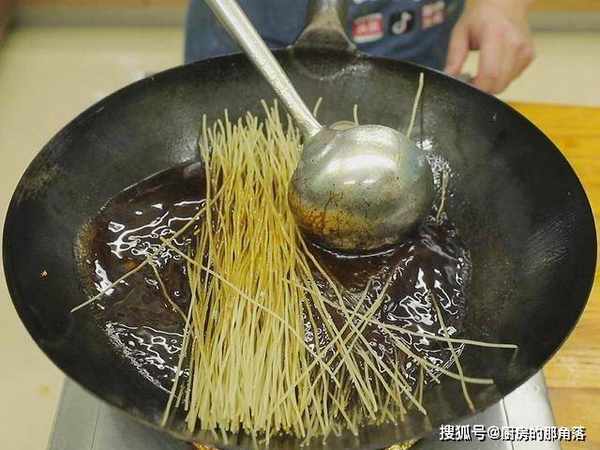 先把料油烧热,加生抽、老抽把酱香味炸出来,再倒进去半盆水,加入干粉条小火慢熬,一直把粉条熬的没有硬芯,捞出来剁碎。