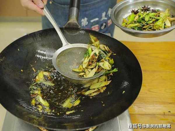 锅里加两勺油,然后把准备好的配料凉油下锅,先把油烧热再转小火,不停地搅拌香菜段最后再放,等到配料炸的金黄干香捞出。
