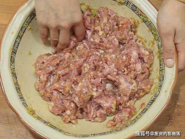 猪肉500克剁成肉馅加入食盐2克、胡椒粉1克、花椒粉1克、生抽10克、生姜泥10克、老抽2克持续摔打2分钟;