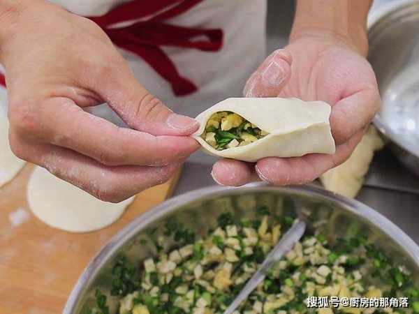 我们在案板上撒上底面粉,揉出空气搓成长条,再揪成大小均匀的小剂子。把面剂子摁扁擀成中间厚一点两边薄的面皮。馅料中放入五香粉6克、鸡粉4克、食盐3克用筷子搅拌均匀。用手托着面皮放上适量的韭菜馅,像包饺子那样对折起来,再把边缘捏在一起即可。