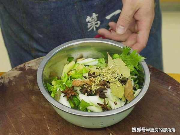 大葱、大姜都切片;青椒拍散切段;芹菜也切段;香菜连根切段;再准备几个八角、良姜、花椒、香叶、小茴香。