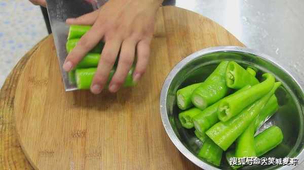 首先准备新鲜的青椒一把,洗净以后擦干净,切去根部不需要去籽,然后再切成两段。
