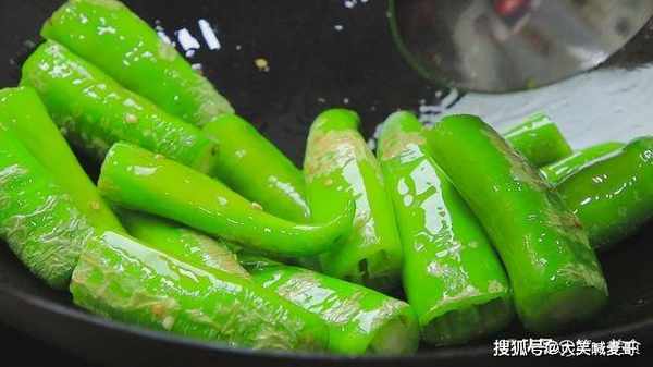 把青椒一面煎至微微起皮,把青椒翻一翻,每一面都煎至起皱后倒出。