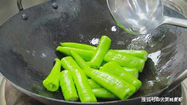 食材准备好以后,我们开始烹饪:锅内烧油,充分滑锅后倒出热油,加入凉油,热锅凉油是防止炒菜时粘锅,放入青椒段,开小火,不停的晃动炒锅。