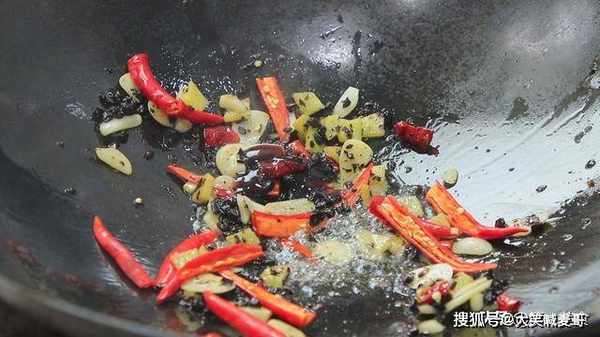 锅内再烧油,放入碎豆豉翻炒几下,放入蒜片和姜片。