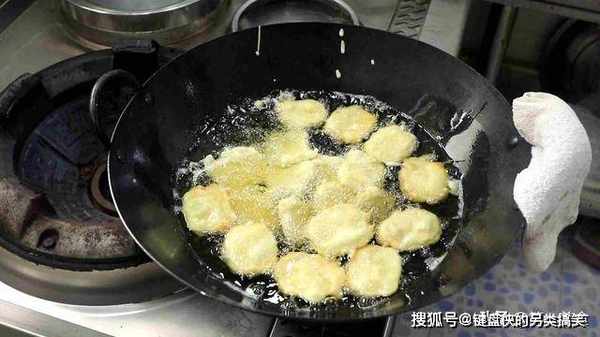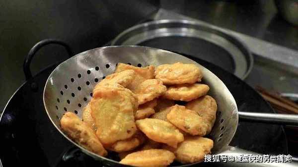 5.食材全部准备好以后,我们开始炸制,锅内烧油,油温升至5成热,油面轻微冒烟时把土豆夹均匀裹上面糊放入油锅中,土豆表层的面糊,遇热后会迅速飘起,起锅或者开小火,继续下土豆夹,这样能保证前后下入的土豆夹色泽和生熟一致。