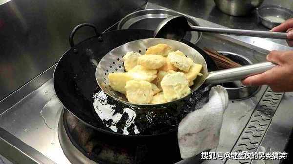 7.把锅中的杂质捞干净,防止炸糊影响卖相,开大火把油温升高至六成热,然后转小火倒入土豆夹复炸30秒钟,把土豆夹炸脆炸成金黄色时捞出控油。