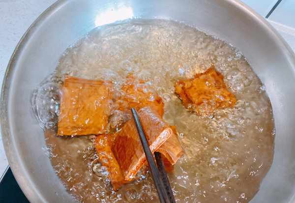 3、锅中加适量的清水,豆干冷水下锅,水开之后再转小火煮3分钟,把豆干煮熟的同时还能去掉一部分豆腥味,豆干煮好之后,出锅备用;