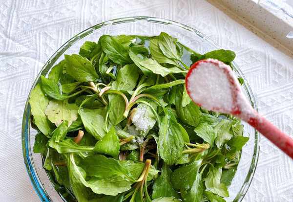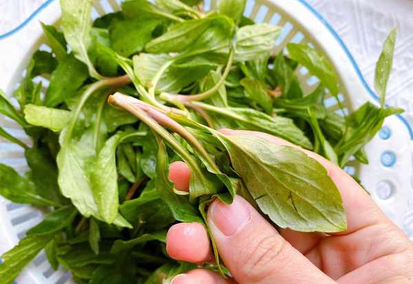 2、准备好的马兰头清洗干净,这是野生的马兰头,梗是红色的,在清洗之前要先挑拣一遍,挑去杂草和其它杂质,在放在流动的清水下冲洗干净,清洗好之后可以放在盐水中浸泡10分钟,再一次菌;