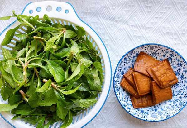 1、准备需要用到的原材料,马兰头和香干,具体食材的比例和分量没有要求,根据自己的喜好决定。
