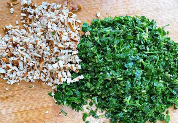5、一大盆马兰头焯水过凉之后挤干水分,就只有这么一点,把挤干水分的马兰头和晾凉的豆干切碎,放在一起,开始调味;