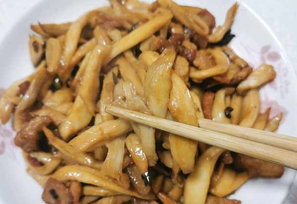 3,肉炒熟之后,把杏鲍菇倒进去,大火炒熟。最后加盐和鸡精,就可以出锅了。