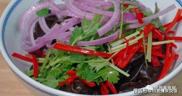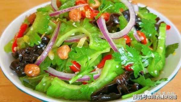 主要食材:苦瓜、洋葱、木耳、香菜、花生粒、大蒜、葱花
