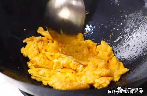3、热锅放油,将蛋液倒进去煎,将鸡蛋炒熟,捞起来备用。