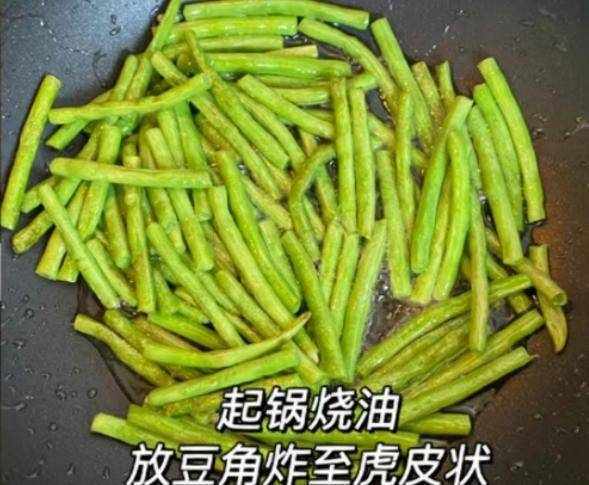 第四步:锅底要多放一些植物油,等待油温烧热乎,倒入一些豆角煎至虎皮状,将其盛出备用。