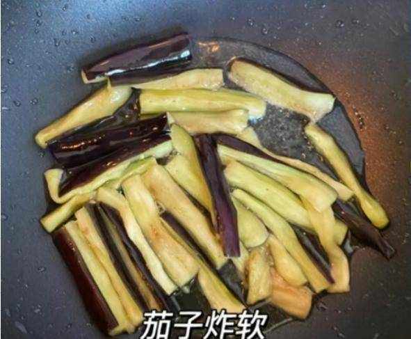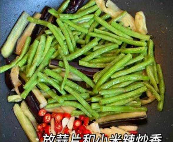 第五步:锅底留少许油,倒入茄子条炒至变软,放入一些豆角,加上蒜片和小米辣,迅速翻炒均匀。